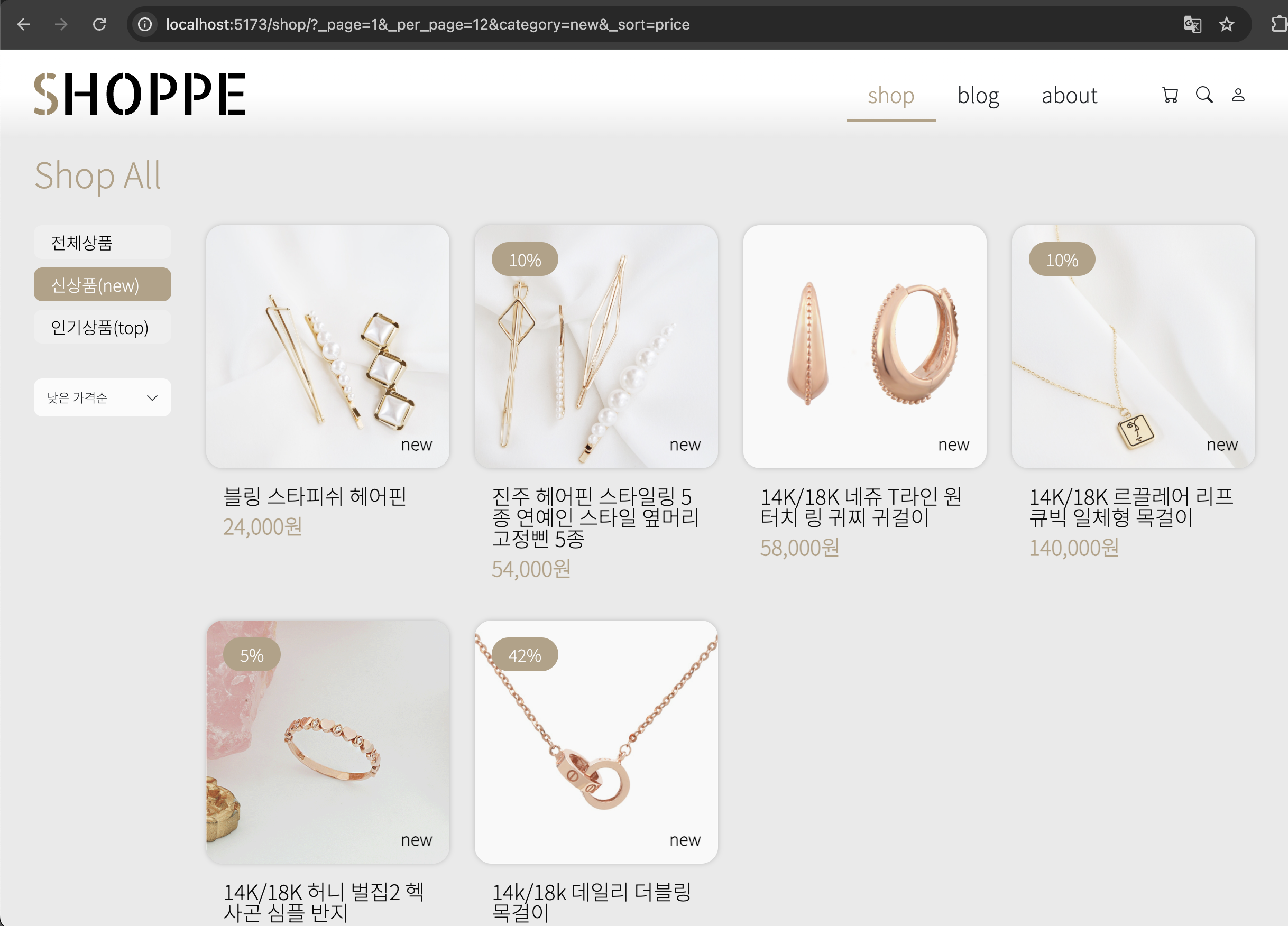 - 카테고리 필터: 전체, 신상품(new), 인기상품(top) 선택 가능