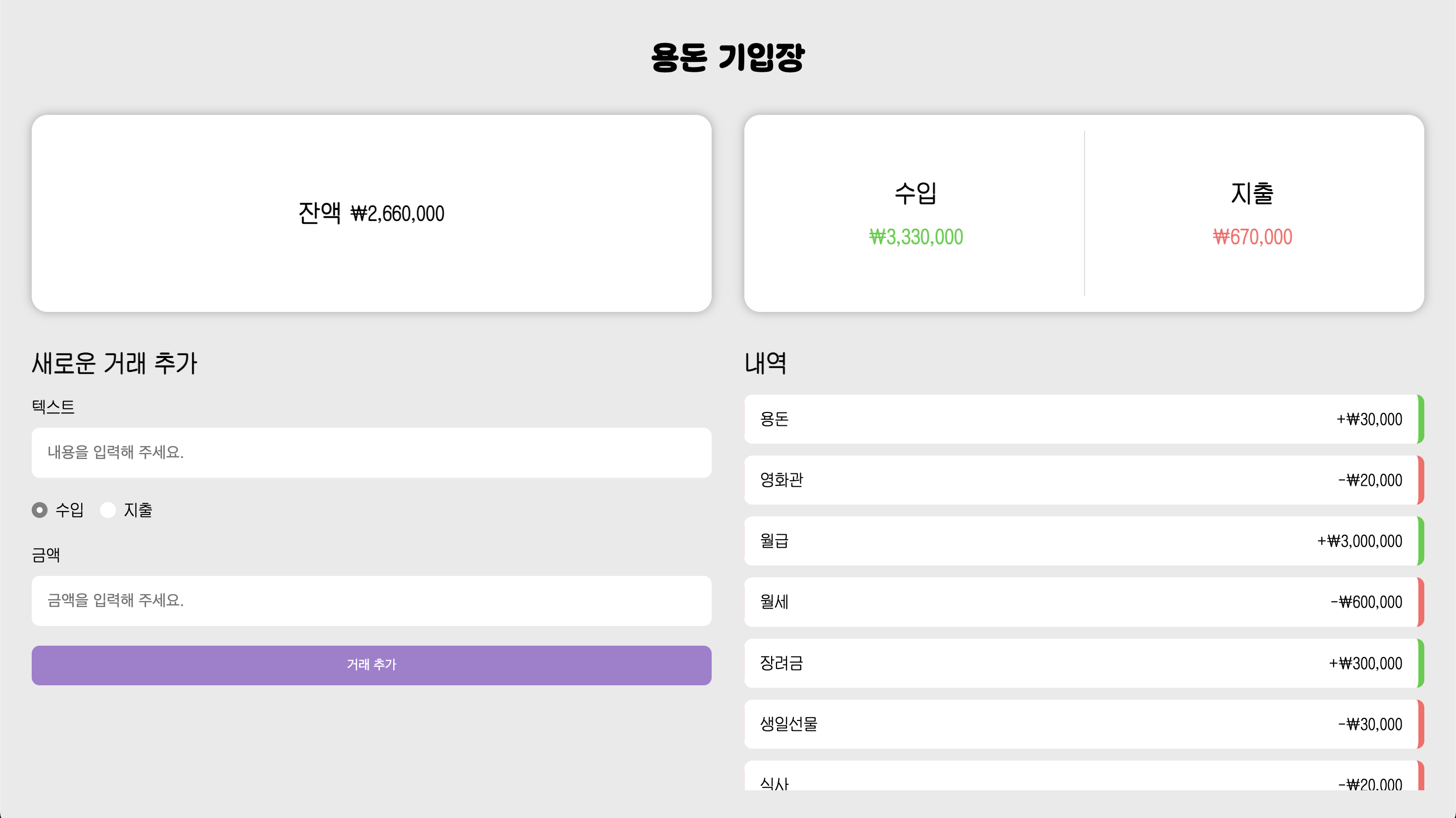 거래 내역 추가, 삭제 기능과 함께 잔액, 총 수입, 총 지출을 한눈에 확인할 수 있습니다.